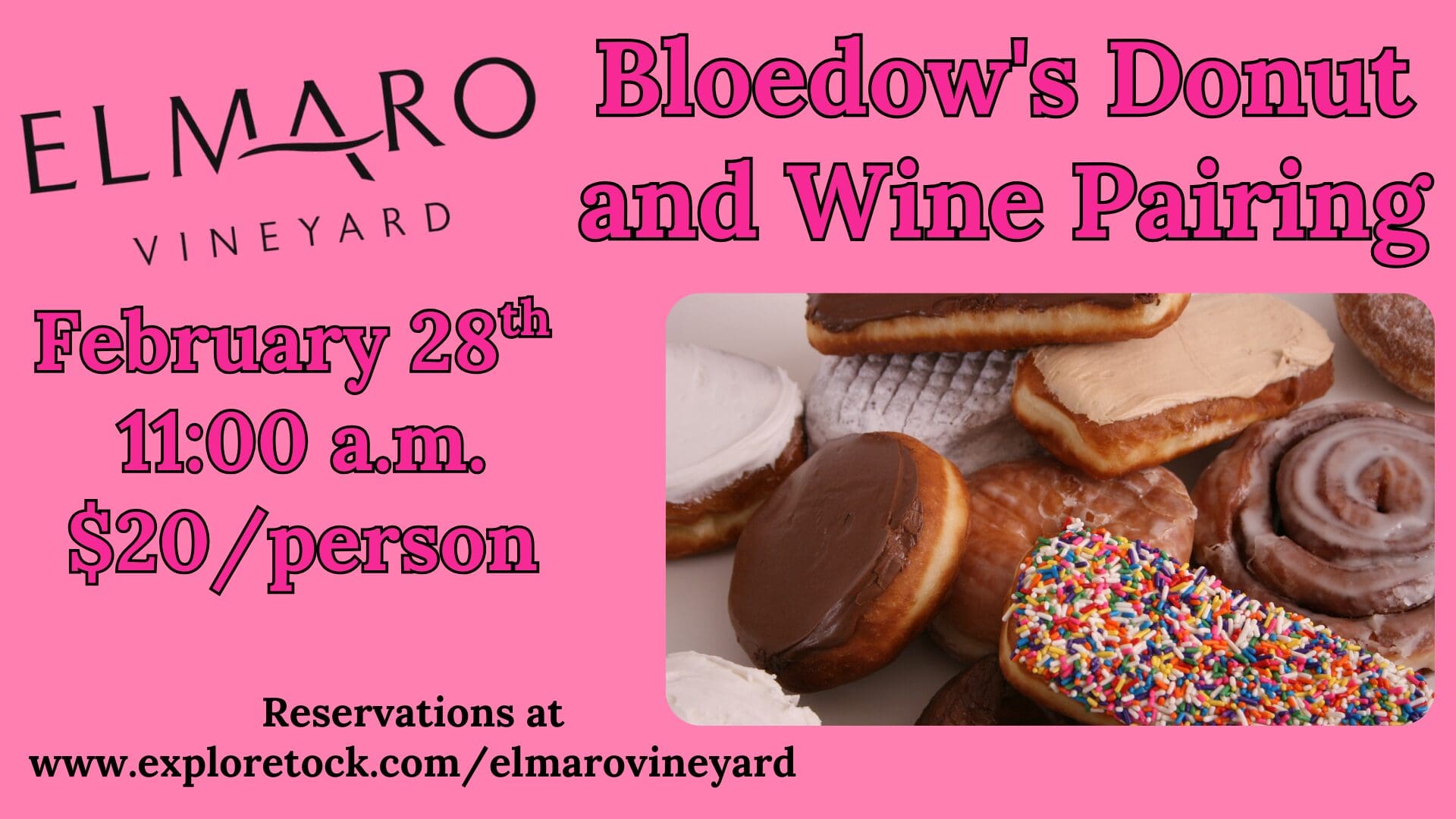 Elmaro wines paired with Bloedow’s donuts! On Saturday, February 28th at 11:00 a.m., $20/person, you’ll sip and savor five donut and wine samples. Stroll through the pairings at your own pace, and come hungry. This year, there's special donut creations in the works that might involve a top selling Elmaro wine!