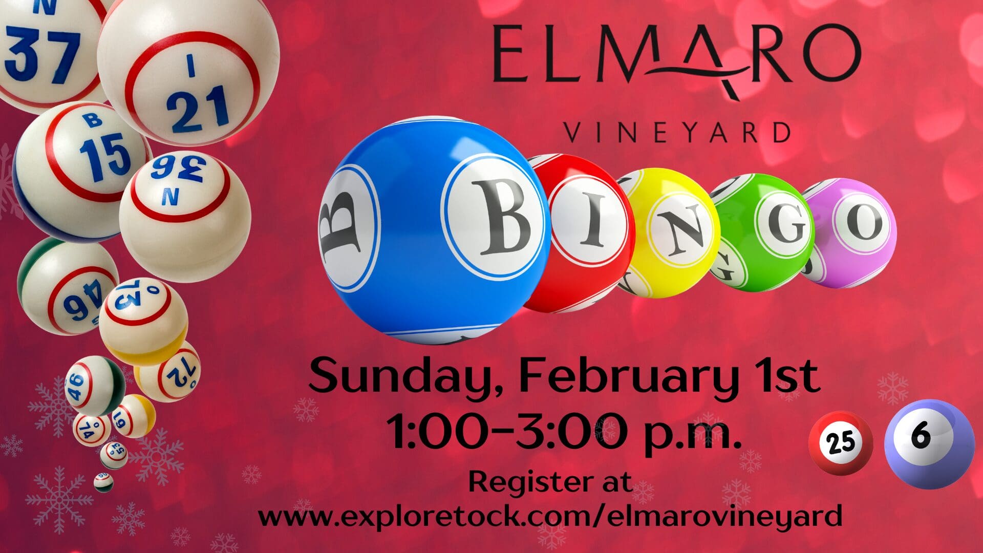 February 1st Sunday Bingo! Let's keep these good vibes going with Sunday Bingo on February 1st, 1-3 p.m.! No fee, but you must reserve your spots at http://www.exploretock.com/elmarovineyard. Two complimentary bingo cards for each guest, assorted prizes, with bingo will begining at 1:00 p.m.
